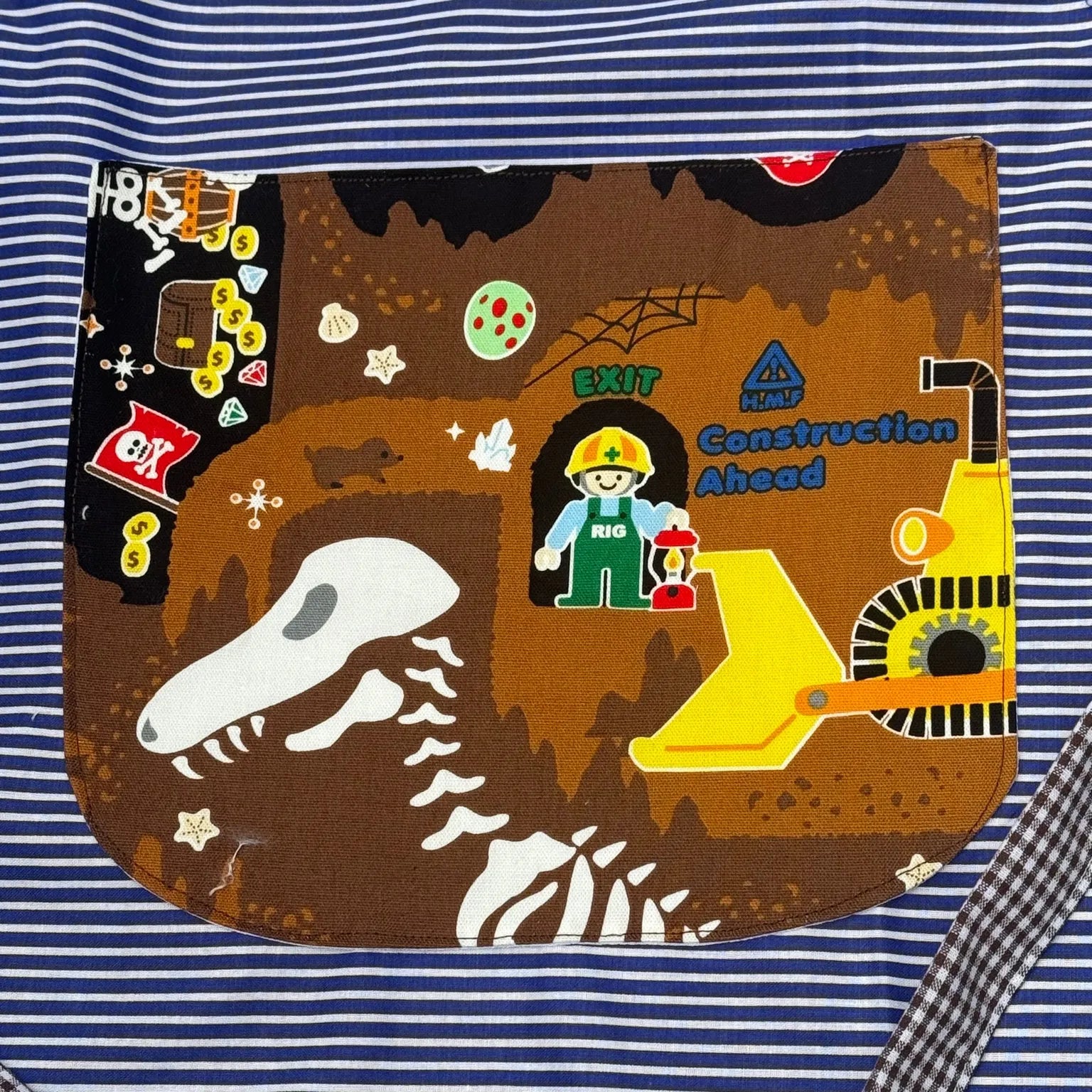 - Farbe: Blau-weiß gestreift mit bunt bedruckter Fronttasche (Dino & Baustelle)