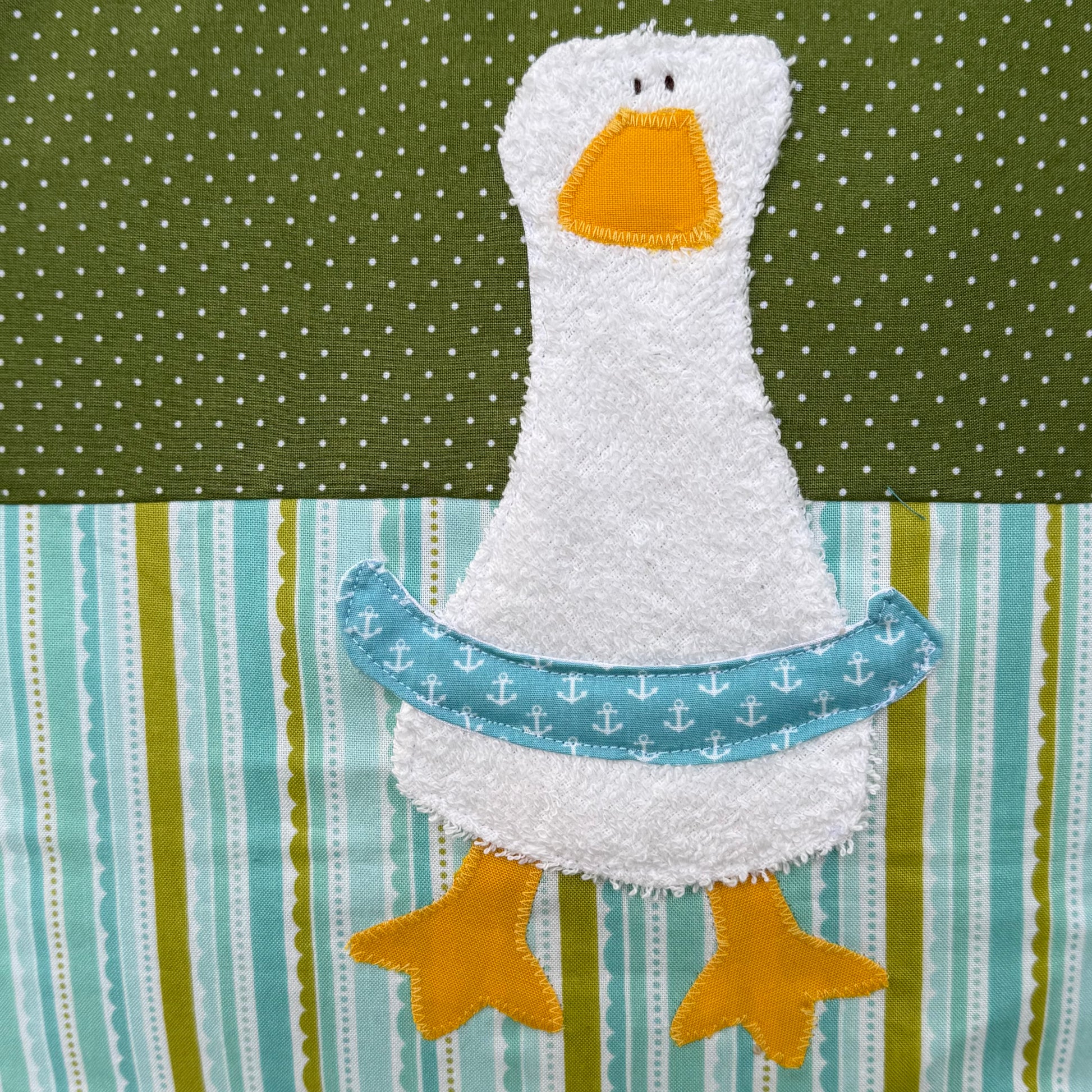 Das Kissen Ente ist ein liebevoll gestaltetes Unikat, das durch seine fröhliche Entenapplikation und die Namensstickerei zu einem besonderen Highlight im Kinderzimmer wird. Die Kombination aus grünem Punktmuster, gestreiftem Stoff in Blau- und Grüntönen und der liebevoll gestalteten Ente sorgt für eine freundliche, maritime Optik.