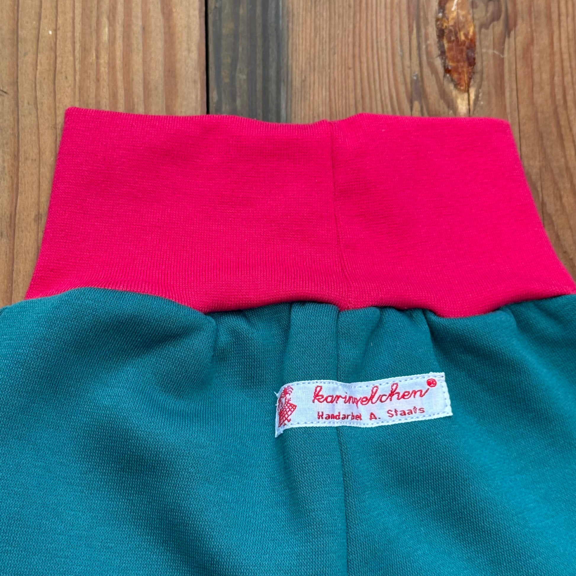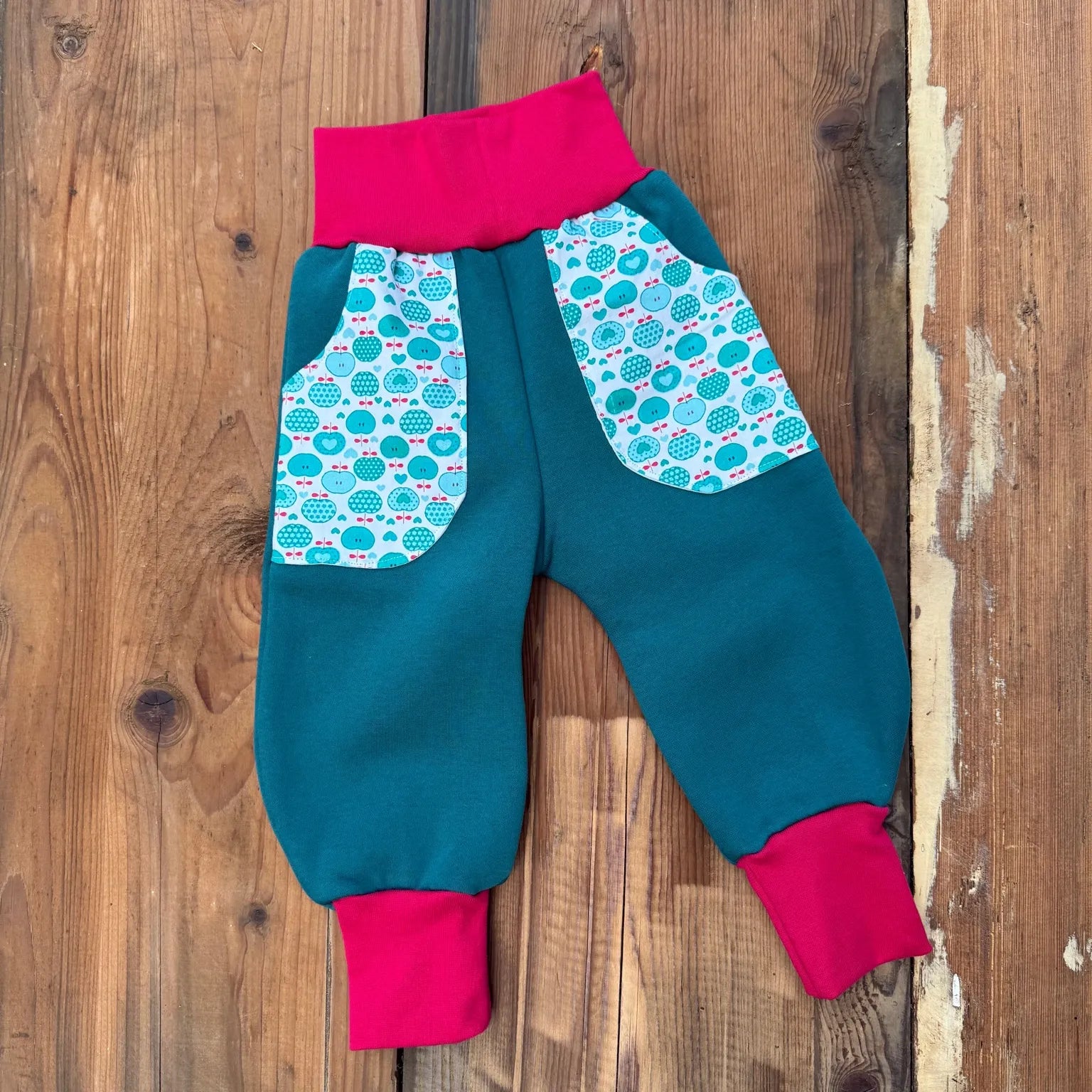Pumphose Sweat Größe 80 – handgemachte Babyhose mit Apfeltaschen, bequem & mitwachsend. Ideal für Alltag, Spiel & Kita.
