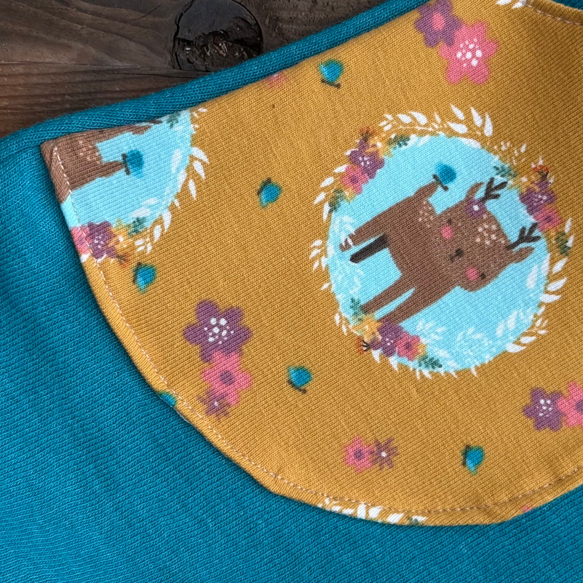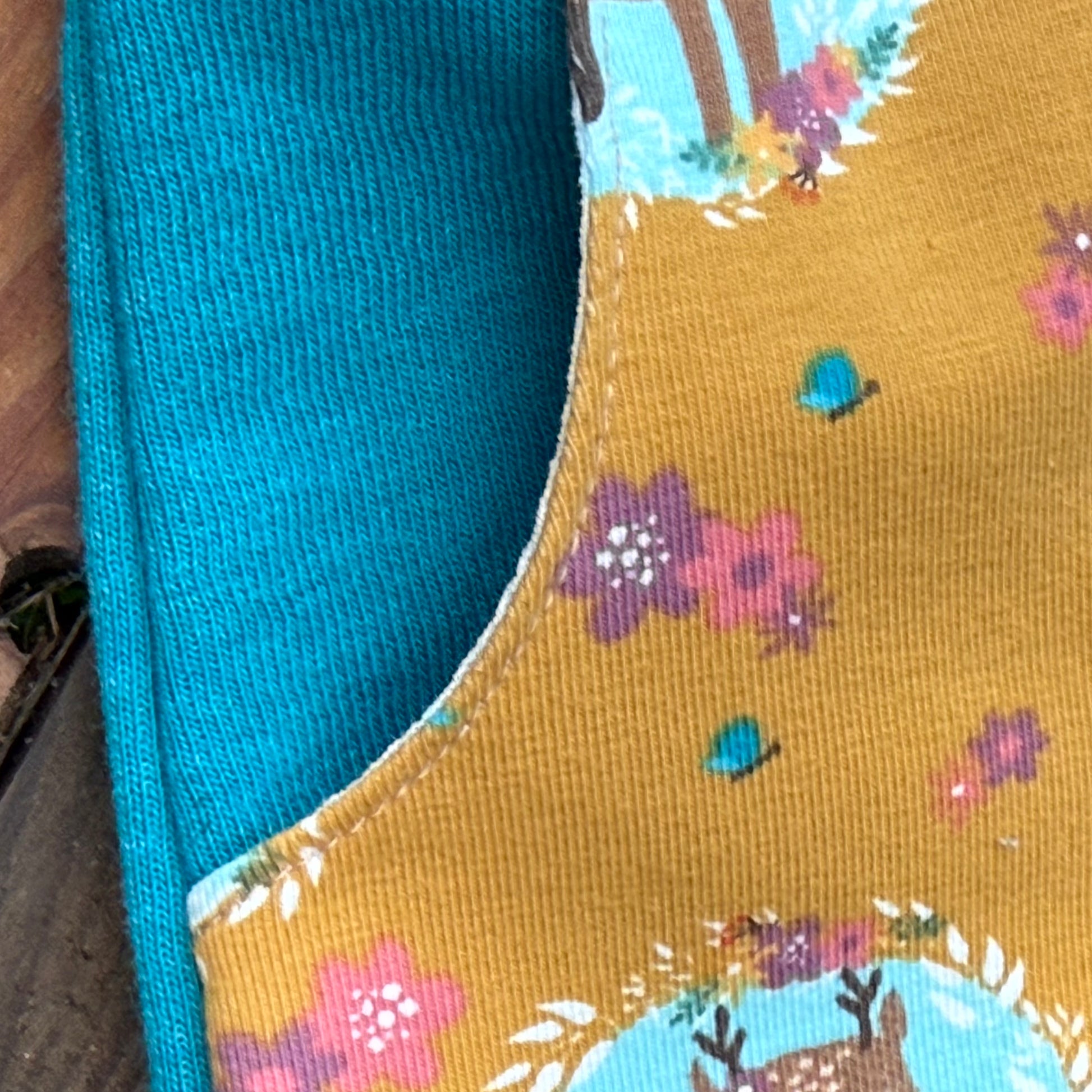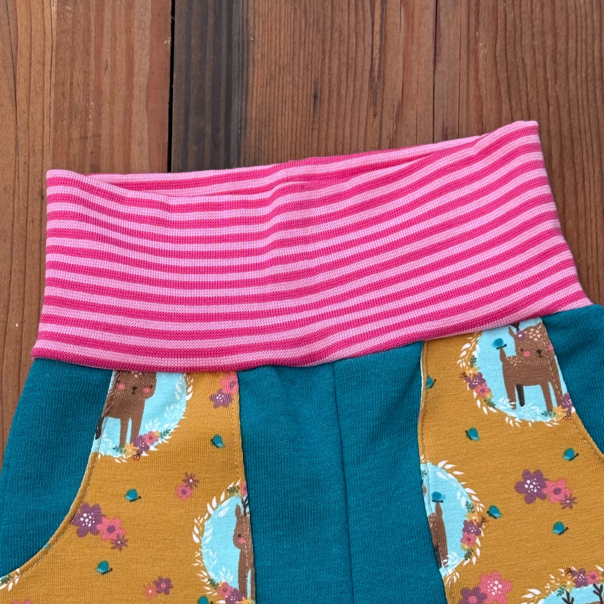 - Liebevolles Design: Petrolfarbene Hose mit senfgelben Taschen und Tiermotiv.