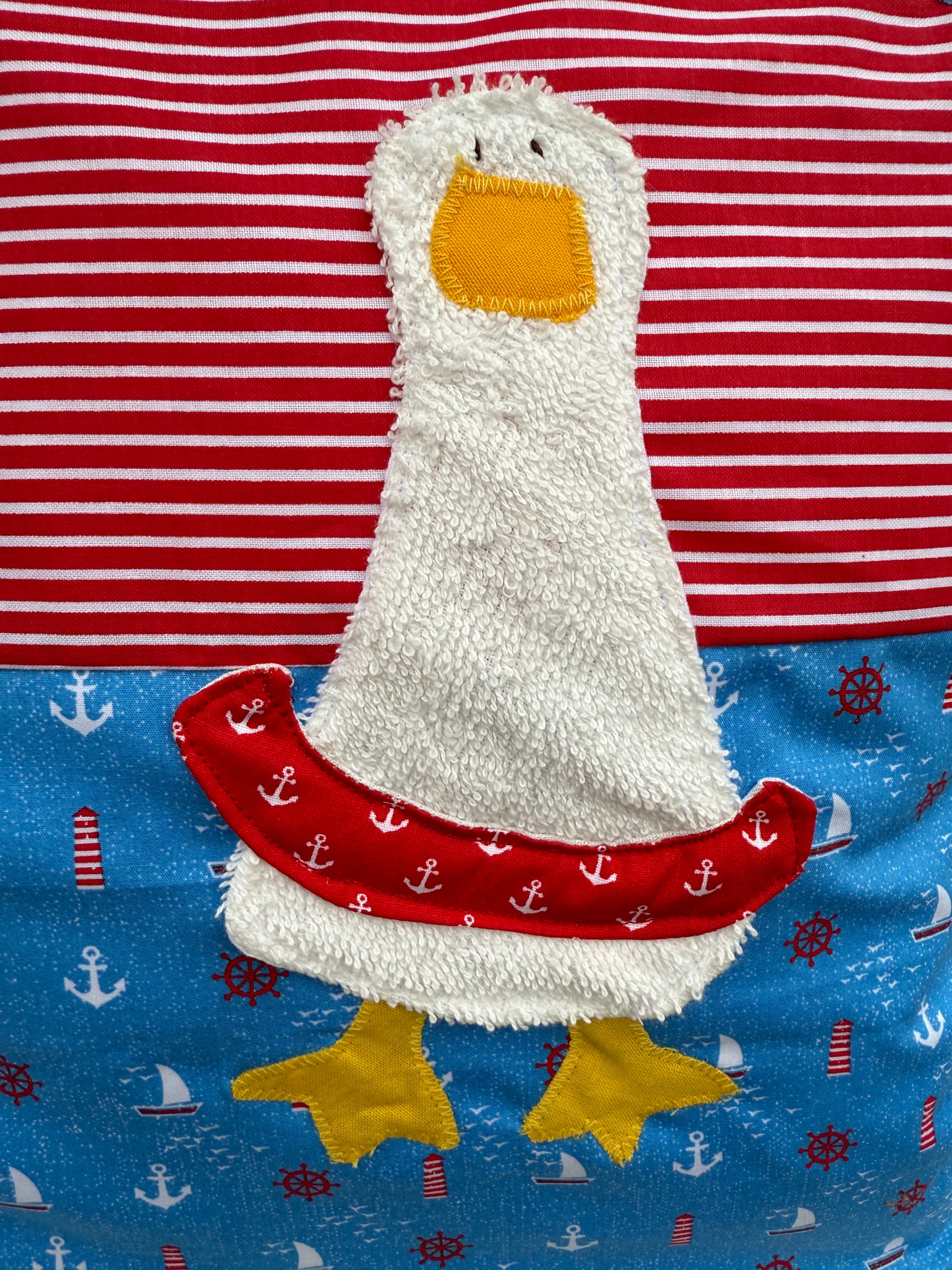 - Design: Rot-weiß gestreift mit blauem Ankerstoff und Entenmotiv