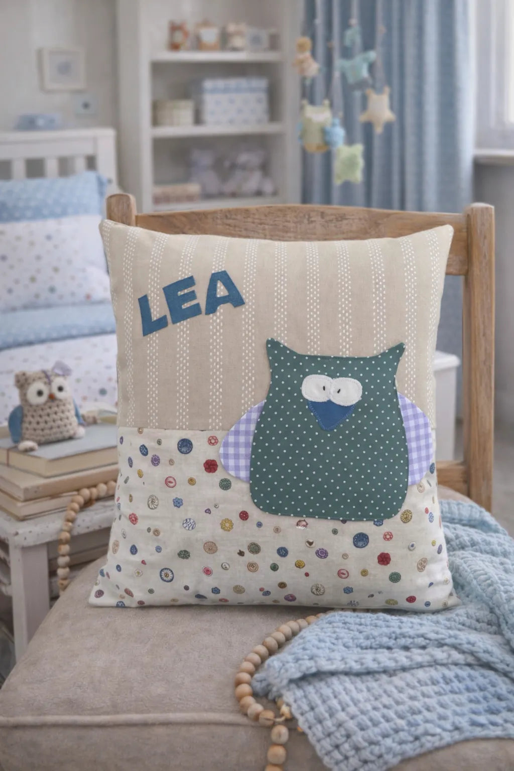 Personalisierbares Namenskissen mit Eule – handgemachtes Unikat