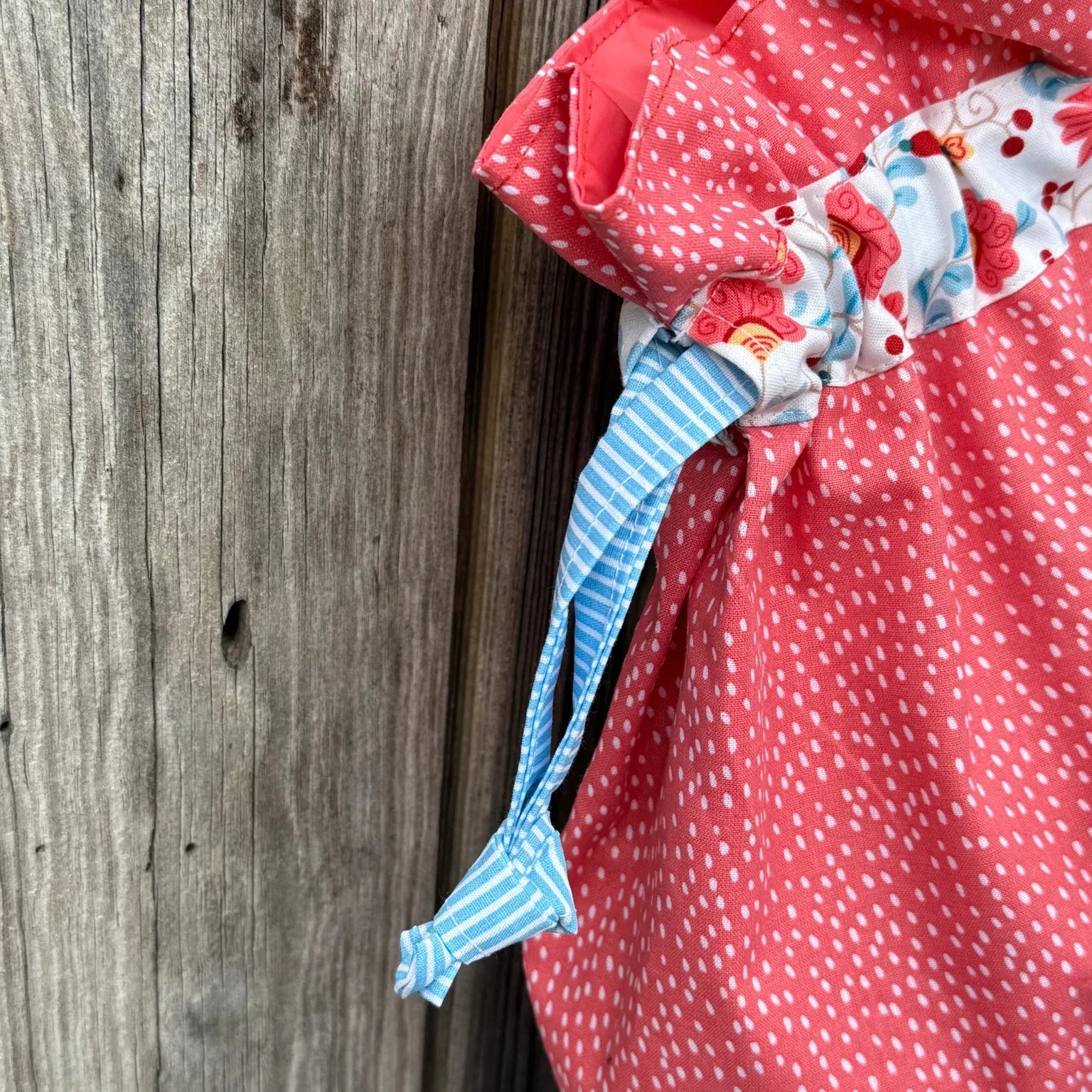 - Raffinierter Tunnelzug oben mit kontrastierendem Stoff und Kordel