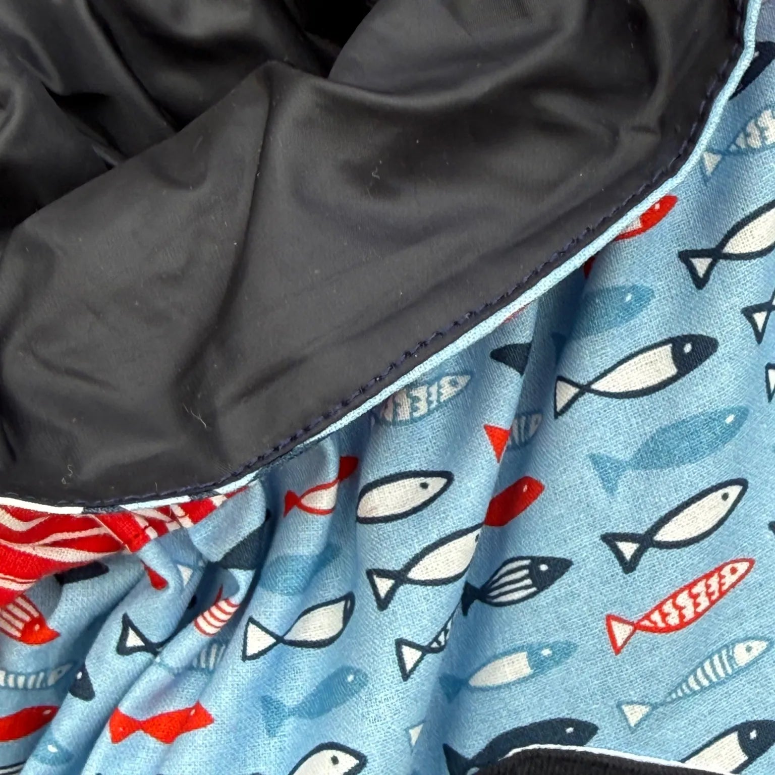 - Außenstoff: weicher Stoff mit maritimem Fischmuster