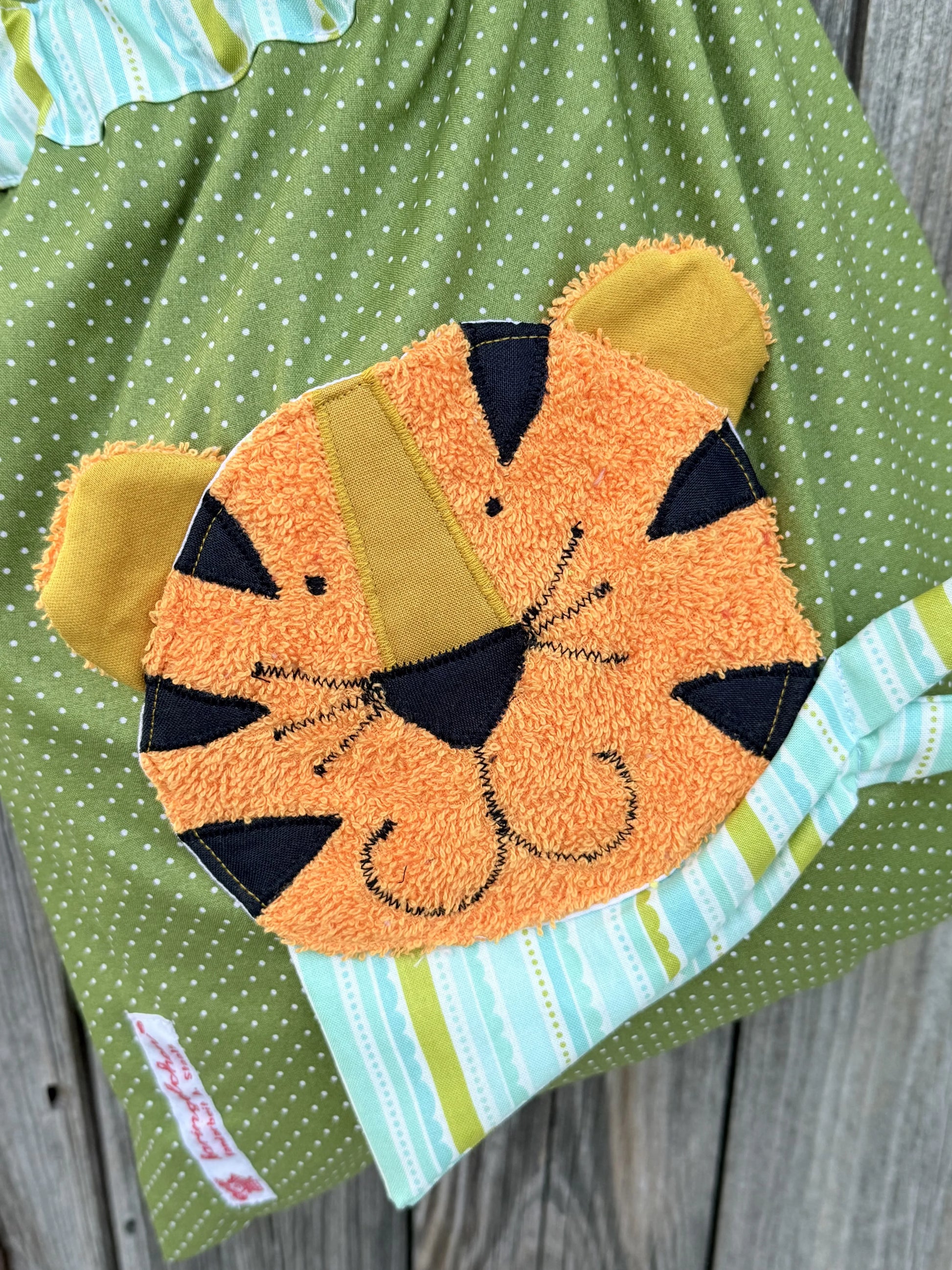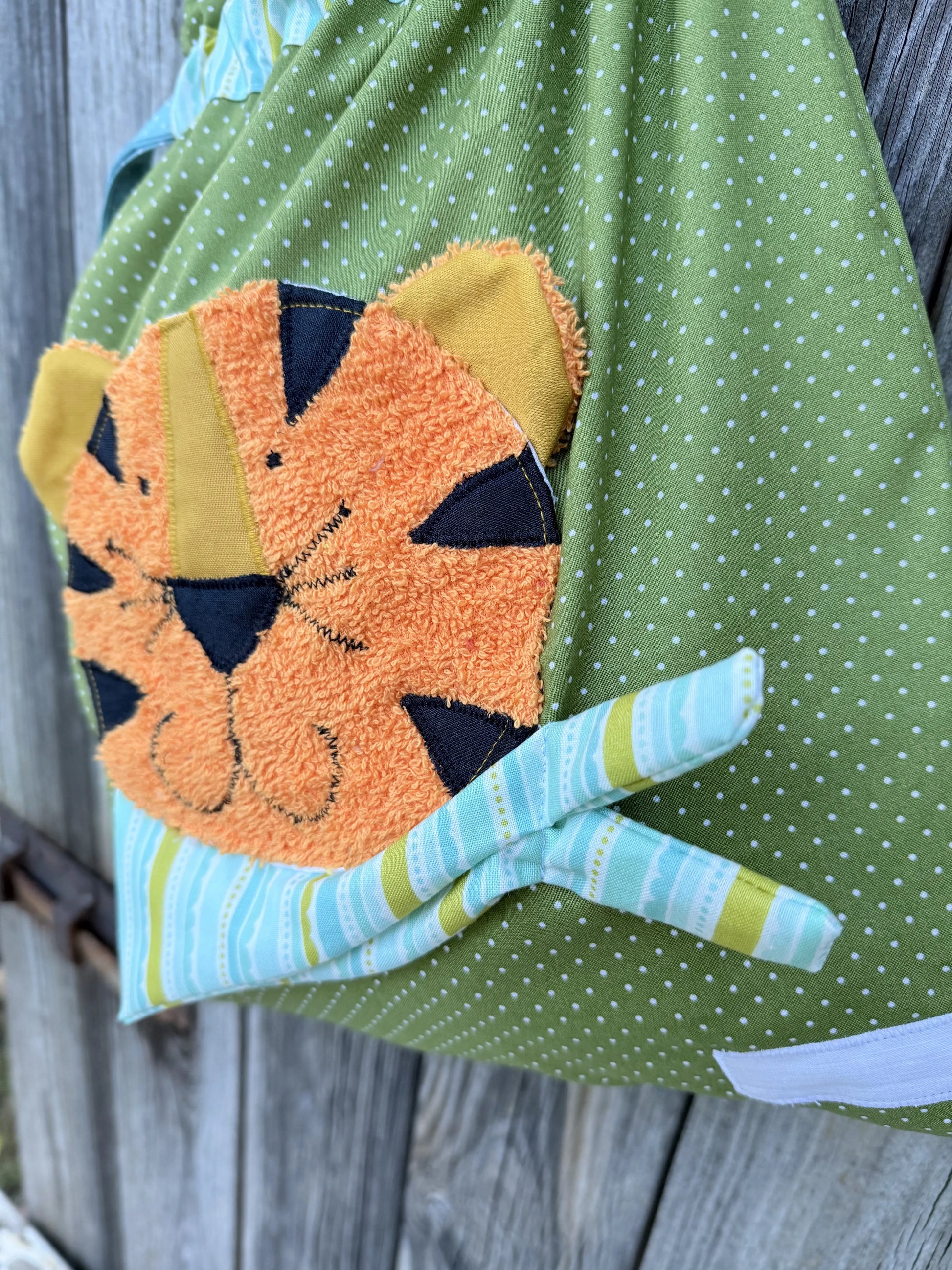 Diese handgemachte Wetbag mit fröhlicher Tiger-Applikation vereint praktischen Nutzen mit liebevollem Design. Sie hält Feuchtigkeit und Gerüche zuverlässig zurück – ideal für Kita, Schwimmen, Sport, Reisen oder als stylischer Aufbewahrungsbeutel für unterwegs.