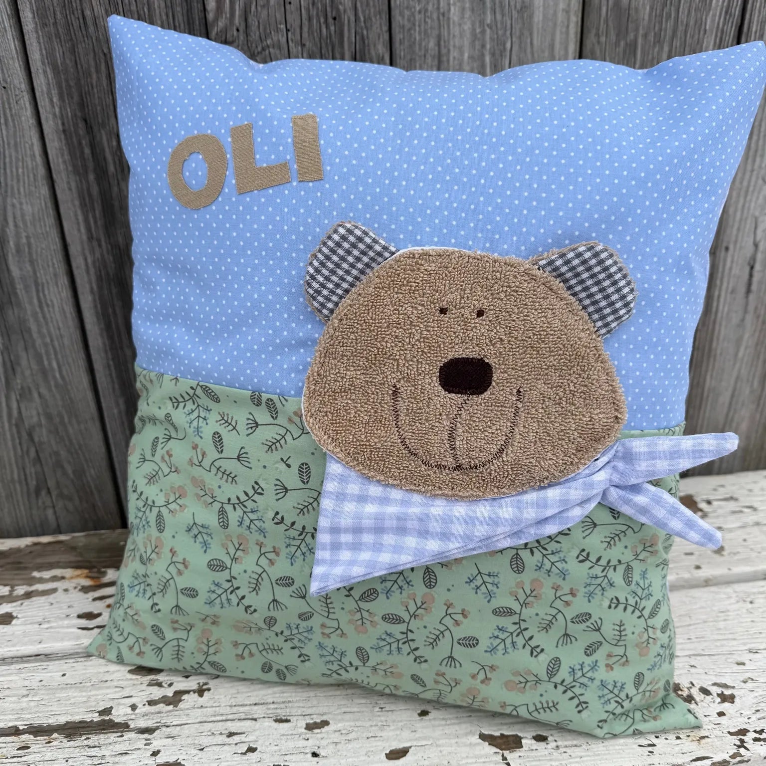 Das Kissen Bär ist ein liebevoll gestaltetes, handgefertigtes Kinderkissen, das durch seine fröhliche Bärenapplikation und die Möglichkeit zur Namenspersonalisierung zu einem echten Unikat wird. Das sanfte Türkis mit weißen Punkten kombiniert mit gestreiften Stoffen in Blau- und Rottönen macht es zu einem dekorativen Blickfang im Kinderzimmer.