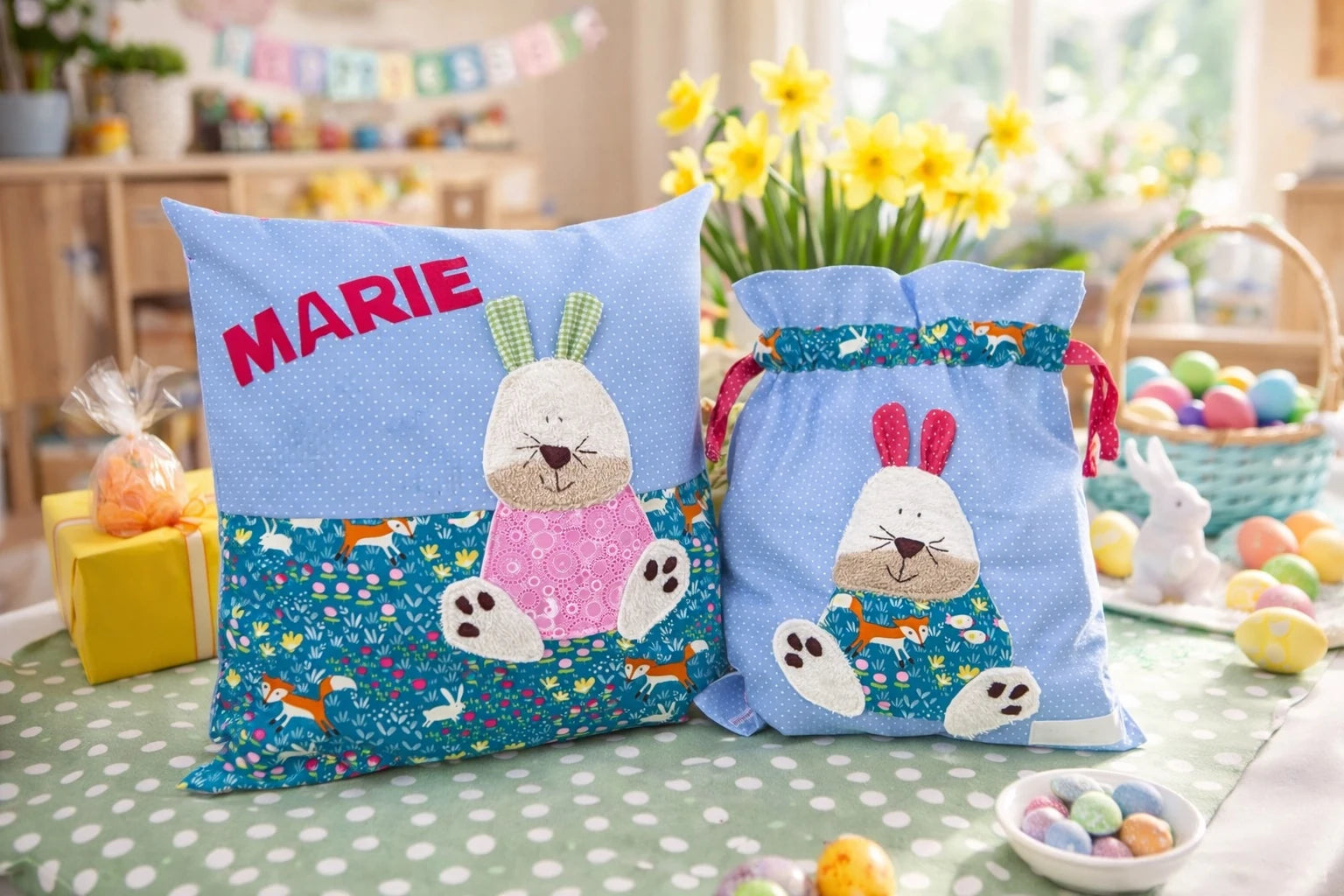 - ✅ Kissen: Weich gefüllt, mit aufgenähten Namen – perfekt fürs Kinderzimmer, Motiv Hase auf hellblau gepunktet